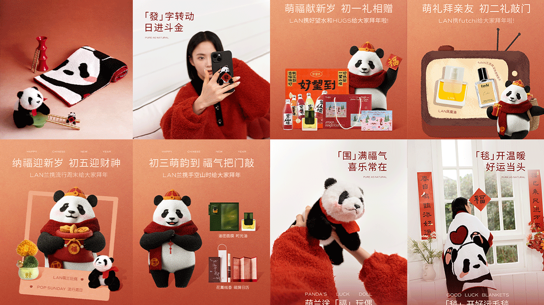 纯净功效护肤品牌LAN兰,作为精华油市场后进者,需要在国内外竞品市场中争得一席之地。品牌精准洞察当下年轻人情绪疗愈需求,瞄准以大熊猫为原型的萌兰IP为品牌强化“治愈力”基因,为广大用户送上一份新年独有的“LAN不住的好运”与“萌感治愈力”。品牌希望通过萌兰IP效应,提升品牌知名度与辨识度,通过萌兰治愈系形象与联名好物,提升产品认知度及实现用户增长。