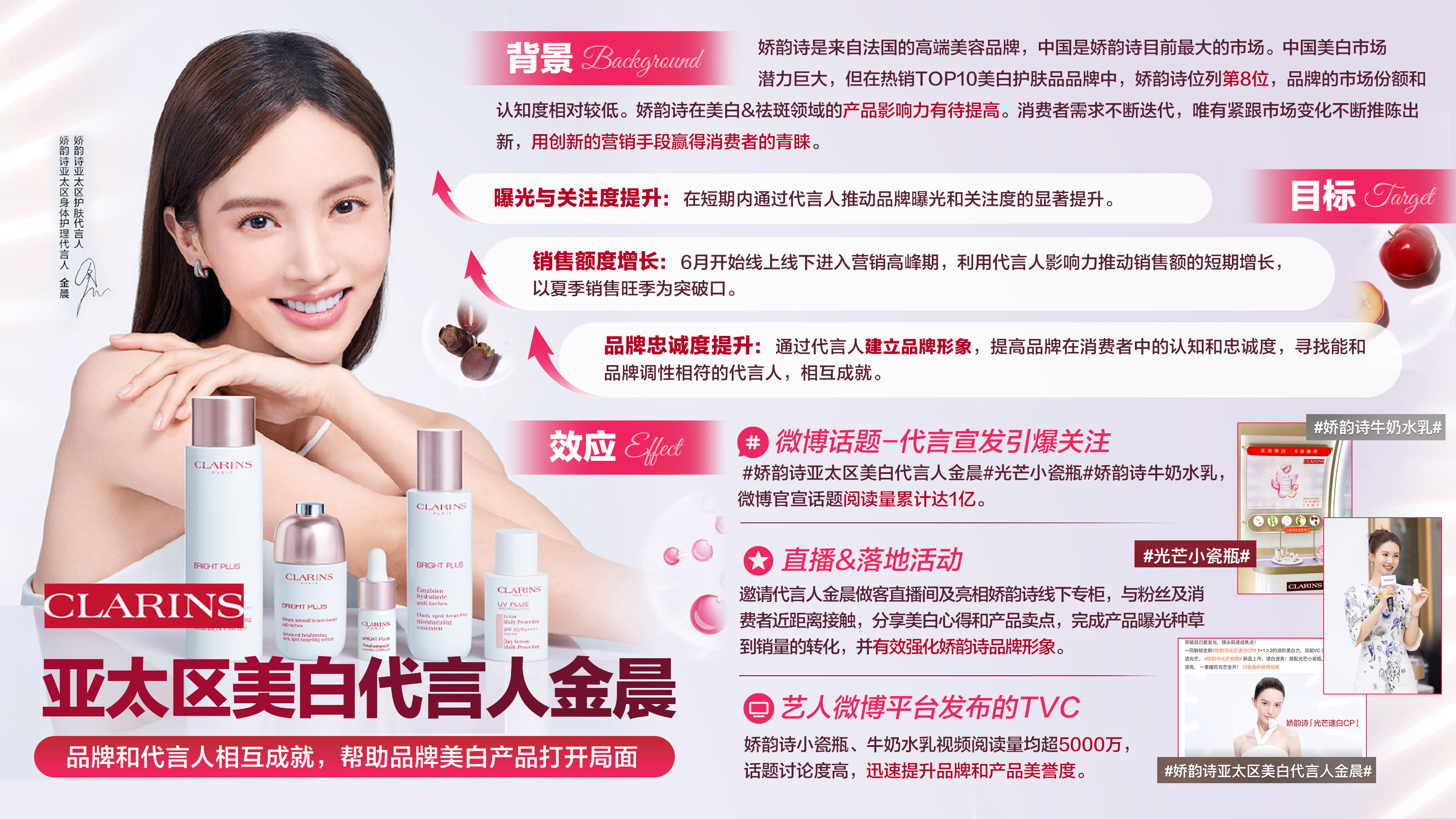 借势优质代言释放影响力,着眼短期增长与长期形象,帮助娇韵诗在全年营销高峰快速提升美白&祛斑产品声量。